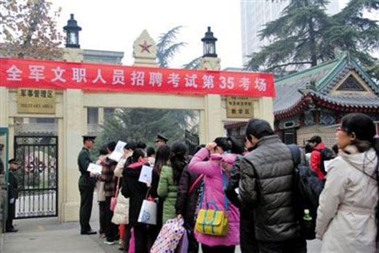 12月15日,在解放軍南京政治學(xué)院考點(diǎn),考生等候進(jìn)場(chǎng)參加考試。當(dāng)日,軍隊(duì)首次統(tǒng)一招聘文職人員考試舉行,據(jù)解放軍總政治部有關(guān)部門介紹,共有10萬(wàn)余人報(bào)名應(yīng)聘,報(bào)名和錄取比例平均為38∶1。